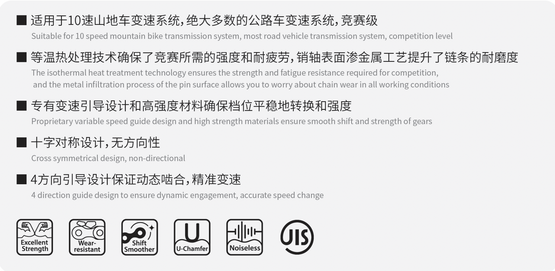 Suitable for 10 speed mountain bike transmission system, most road vehicle transmission system, competition level