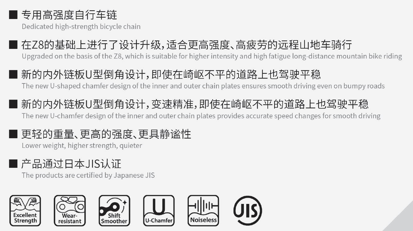 Dedicated high-strength bicycle chain,The products are certified by Japanese JIS